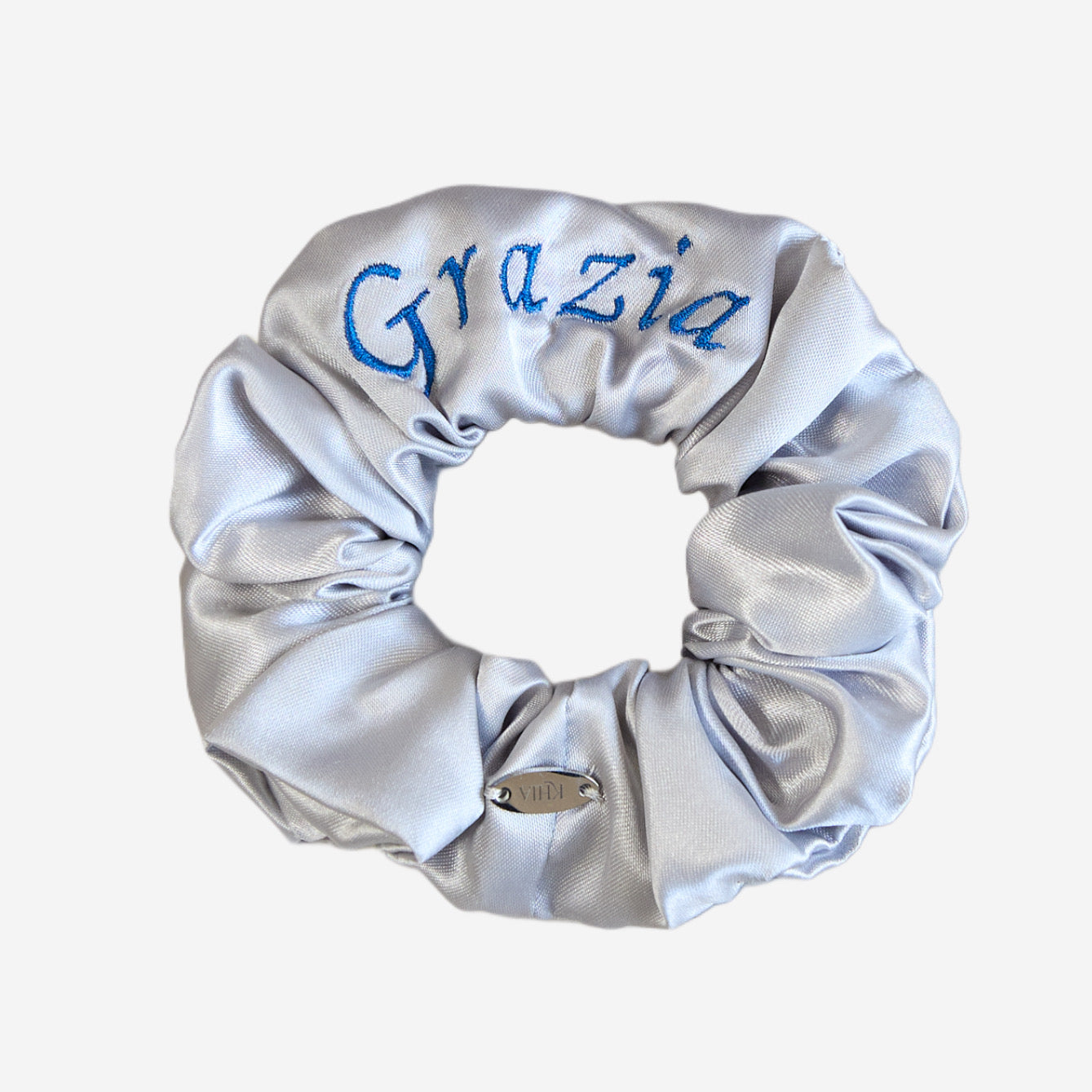 Completa il tuo look con un dettaglio che fa la differenza. Lo scrunchie Khia in raso argento, misura media, è pensato per chi ama distinguersi con classe e ricercatezza.